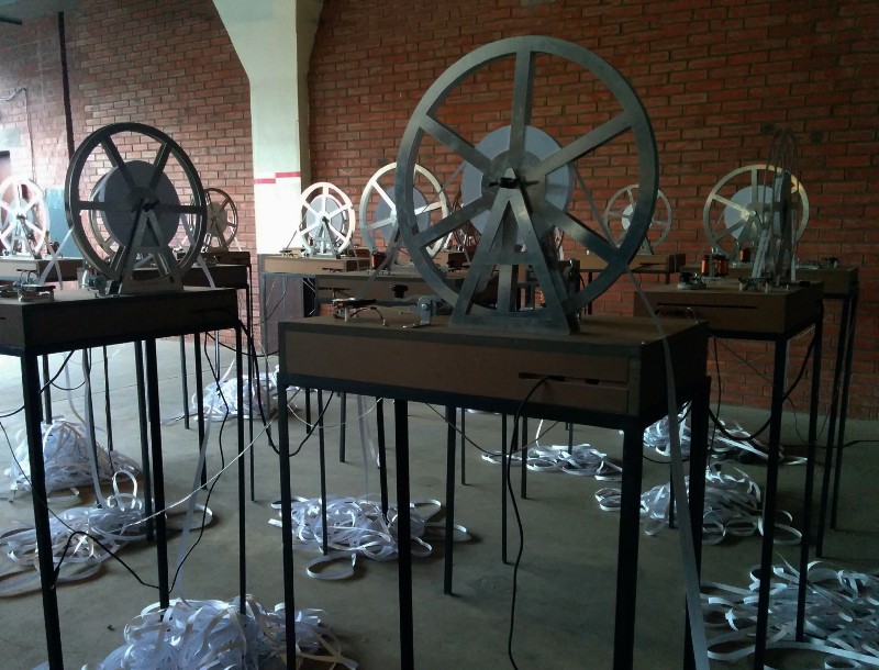 Cette oeuvre est composée de quinze télégraphe branchés en série. Lorsque l’on s’en approche, on distingue donc rapidement le son des entrechoquements des interrupteurs Morse qui, par des impulsions brèves et longues, envoient et reçoivent des informations. Par ces impulsions, les mots transmis sont traduits en sons et en lumières, puis sont estampillés, reportés visuellement sur des serpentins de papiers. Ceux ci se déroulent et tombent lentement au sol, comme pour témoigner du foisonnement des communications passées. Ainsi, les sons secs et métalliques rythment le flux de cette cascade de messages à décoder.