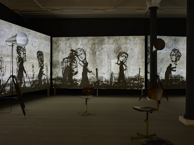 Dans l’oeuvre More Sweetly Play the Dance, l’artiste William Kentridge traite du passage de l’individu à travers le temps et à travers l’espace. Dans une installation immersive il met en action des silhouettes humaines se mouvant de panneaux en panneaux, dans une farandole de formes obscures et confuses. Ces spectres visuels aux identités et desseins incertains peuvent évoquer la lente procession de populations en exil, mais aussi le dur labeur des travailleurs de l’ombre dans la machinerie de nos sociétés. On y voit parfois les rouages de métal et le bois mis en action, on y distingue les dactylographes à la tâche et les hommes politiques qui discourent, les travailleurs qui croulent sous le poid porté sur leur dos, sur leur tête, ou encore la revendication d’une avenir meilleur par l’iconographie du porte-voix.