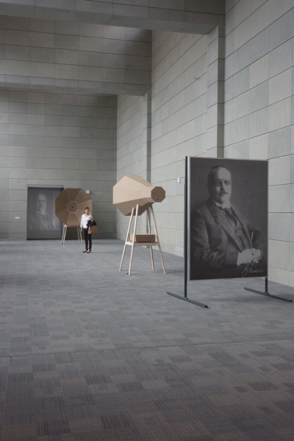 L’oeuvre Modulateur-Démodulateur est un dispositif composé de deux structures de bois, aux rôles respectifs de transmission et de réception d’un signal sonore. Les formes de ces deux structures évoquent leurs fonctions ; l’un ressemble à un mégaphone, l’autre à une parabole. Une reproduction photographique est placée sur le mur derrière le transmetteur et une vidéo est projetée contre le mur derrière le récepteur.