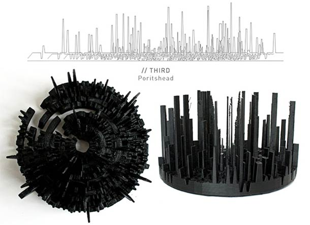 De Kandinsky à Paul Klee, par la synesthésie intuitive ou encore la représentation symbolique codifiée, les artistes ont toujours tenté de toucher à une représentation visuelle de la musique et des vibrations sonores en général. La présence réelle d’une physicalité du son n’étant plus à défendre, rendre palpable cette physicalité sans cesse sous différentes formes est une exploration qui passionne les créateurs, notamment grâce aux outils que nous disposons aujourd’hui et qui peuvent le permettre. Avec le projet Microsonic Landscape du collectif Realität c’est, au delà même de modeler la matière par l’onde sonore, l’idée de rendre physique et de pouvoir comparer les créations musicales par leur formes singulières qui est en jeu. Le projet retranscrit par un algorithme spécifique et une imprimante 3D des albums musicaux tels que “Thrid” de PortisHead ou “Pink Moon” de Nick Drake. En somme, il s’agit là du chemin inverse que celui tracé par Aphex Twin lorsqu’il retranscrit son autoportrait en ondes sonores intégrées dans le spectrogramme d’un de ses titres de l’album “Windowlicker” (à voir ici : www.youtube.com/watch?v=M9xMuPWAZW8).