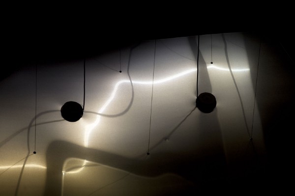 La surface d’aluminium, par ses propriétés réfléchissantes retranscrit graphiquement ces mouvements ondulatoires par la lumière. L’espace est ainsi sculpté tant par la lumière qui dessine les formes que par les formes du matériau en lui même.
